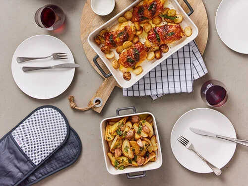 The Epicurious double oven mitt is a stylish new take on a kitchen essential. Made from durable cotton twill, it features a contemporary design in white and charcoal grey that will suit any home. Perfect for entertaining, it offers additional protection for handling heavy bakeware, pots and casseroles. It’s also designed to complement the rest of the Epicurious collection, for a beautifully coordinated kitchen.