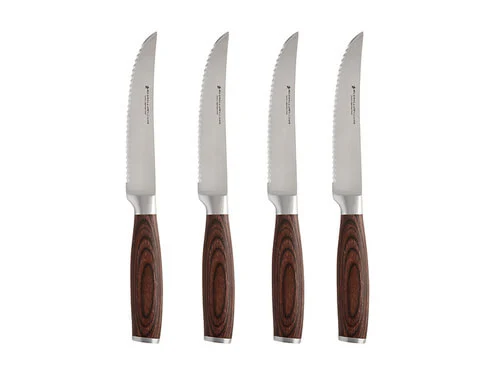 Get cutting edge with our Stanton steak and cheese knife sets. Made from quality stainless steel, these knives have superior strength and durability. Stanton steak knives have a serrated edge to glide through even tough meats without tearing or crushing. Cheese knife sets include a fork-tip blade, a spreader and a perforated blade for clean slicing through soft, medium or hard cheeses. Each stylish set comes with a choice of three handles – stainless steel, black or wood.